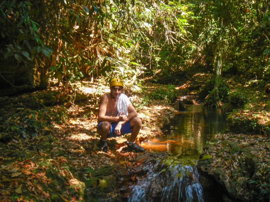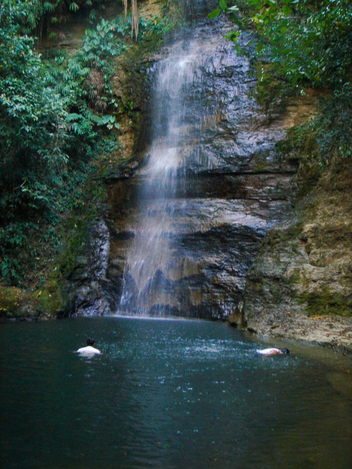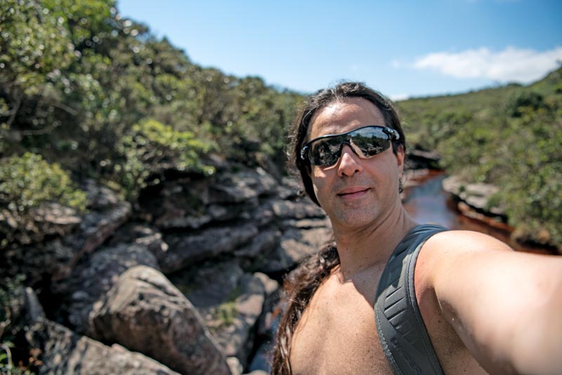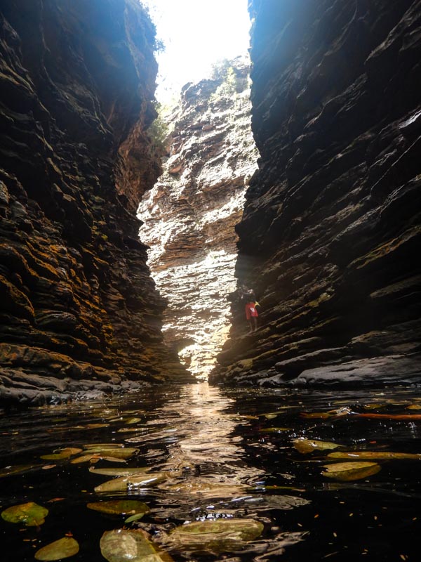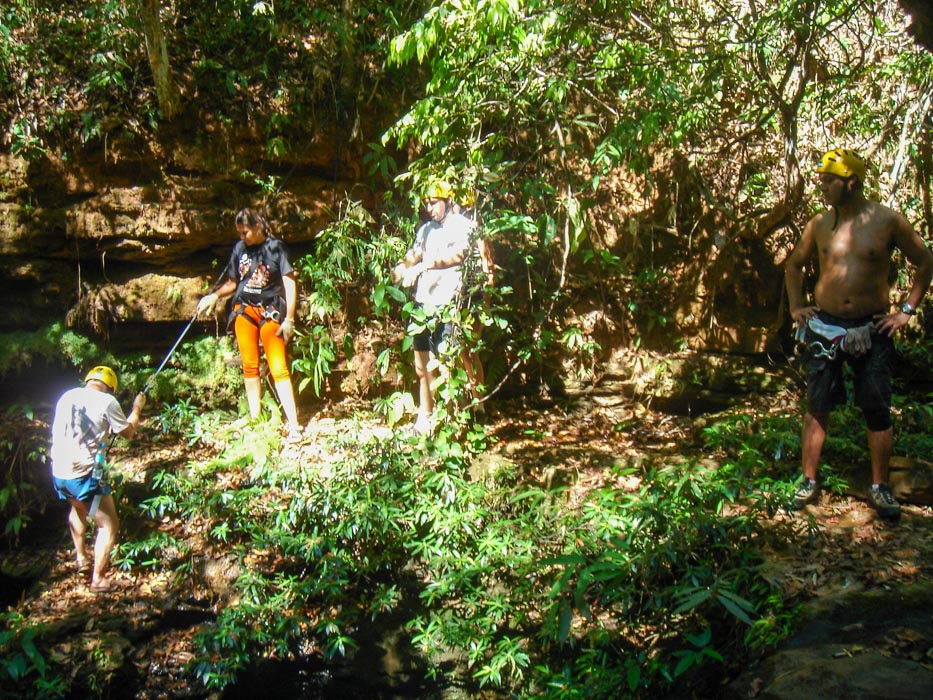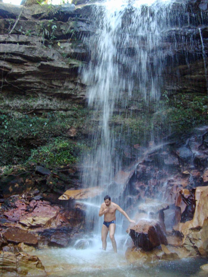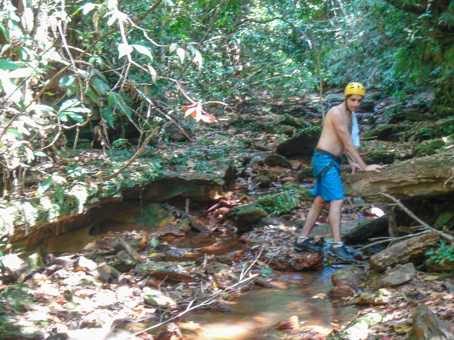 Temos que deixar todo o equipamento extra lá e ir até a cachoeira por dentro da água! É bem legal!
