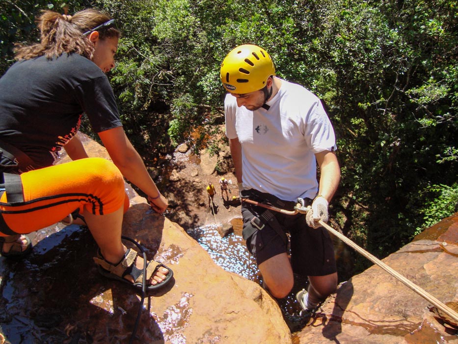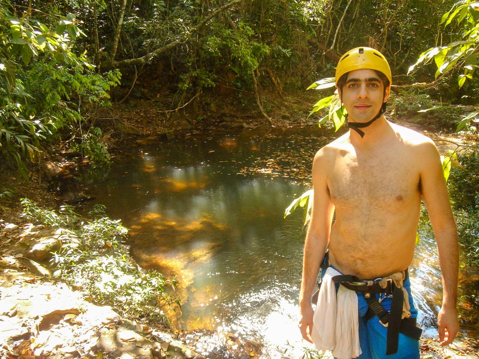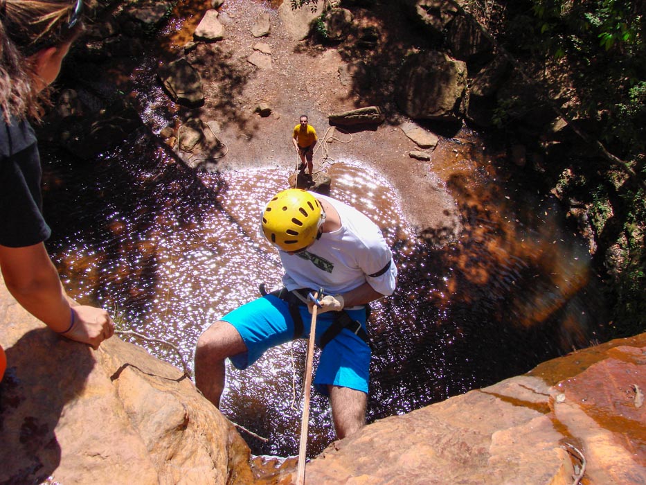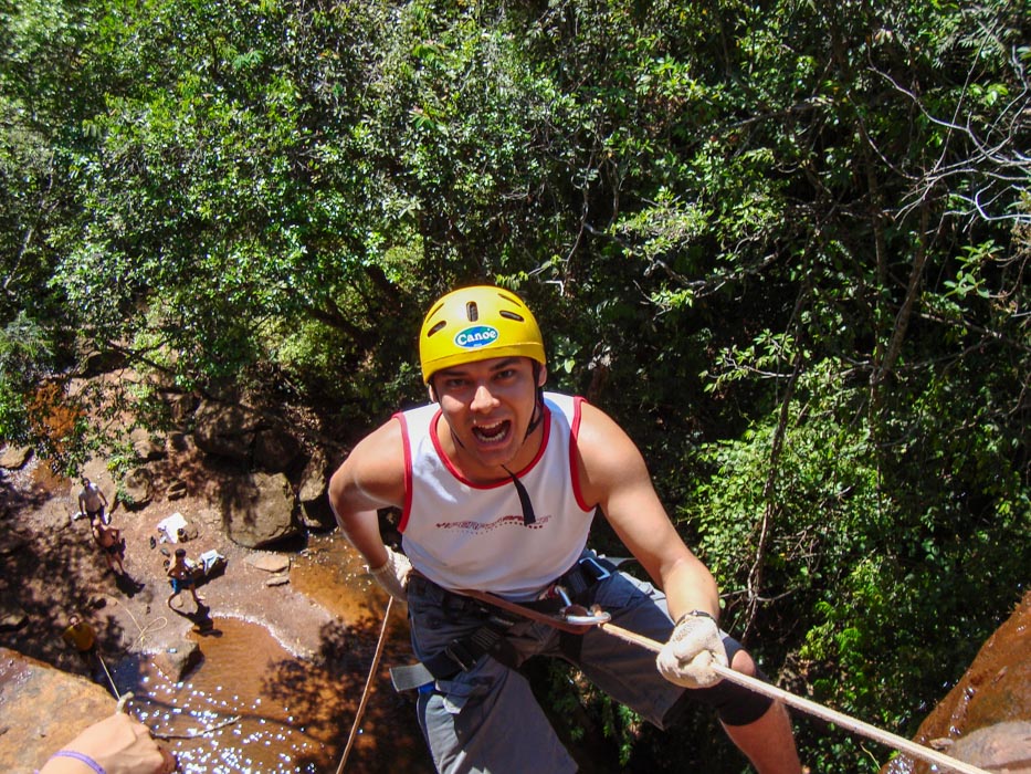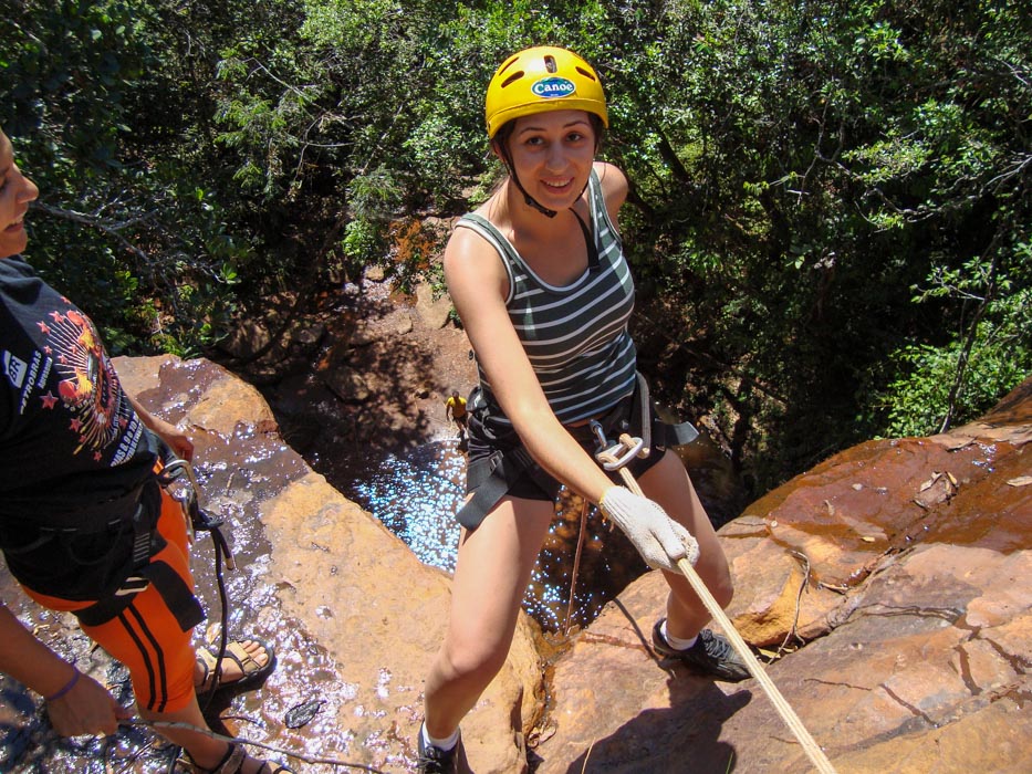 Esse era o dia do Rapel! Se não me engano o nome do passeio era Canionismo. Nossa trilha era acompanhando a descida do rio, onde fizemos 3 rapeis (plural de rapel? Hahaha!), 2 bem altos em cachoeiras lindas e um bem menor apenas para vencer um grande desnível na trilha.