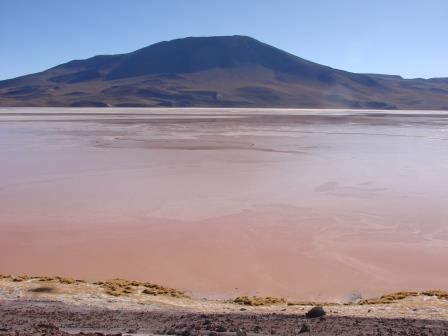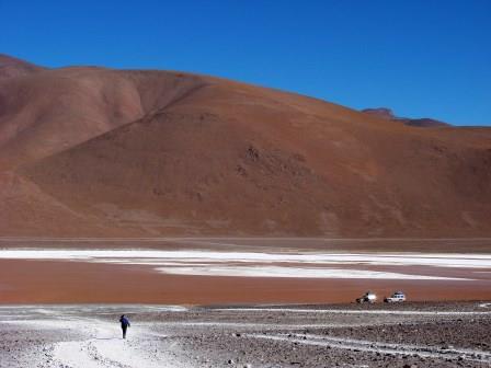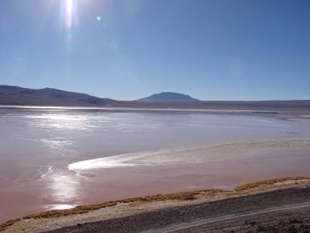 É possível avistar a Laguna Colorada, mas os caras não passam nem perto com o carro. Ela estava bem vermelha nesse horário, mas os caras inventam uma história que estava ventando muito e então não iriam até lá.