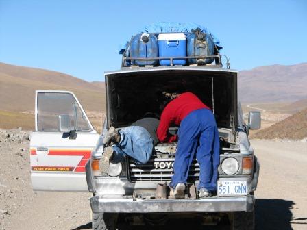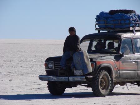 Ficamos um tempo lá e saímos já em direção a Uyuni. Pena que isso não durou nem 5 minutos. O nosso caro ficou sem gasolina… Estávamos sem gasolina no meio do nada! Não dava para acreditar… Bom, depois de ficar caçando aquele imbecil no Salar, estranho seria se não acabasse. Imaginar que eles calculavam a gasolina com alguma margem de segurança obviamente é pedir muito.