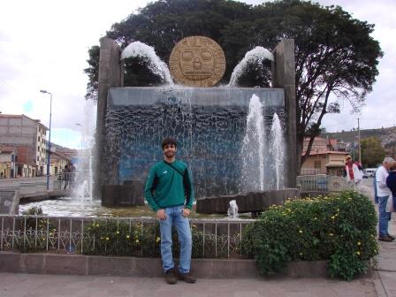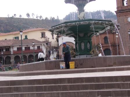 Enquanto estávamos na praça principal pela manhã, sentados em um banco apenas curtindo o movimento, percebi um cara saindo de uma obra ali nas lojas que cercam a praça. O cara me sai com dois baldes e vai em direção a fonte no meio da praça… Estando no Peru, já logo saquei o que viria e lancei mão de minha máquina!!!! Dito e feito, o cara pegava água para o cimento da obra na fonte da praça principal da cidade!!!