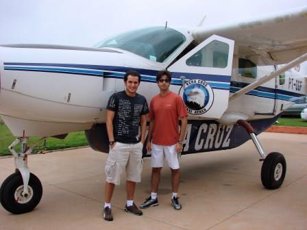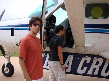 Fomos até São Jorge, na esperança de encontrar algum guia na cidade, mas não rolou. Então fomos até a entrada do Parque Nacional da Chapada dos Veadeiros para pegar um guia lá. De lá fomos para a fazenda onde fica a cachoeira com o guia em nosso carro.