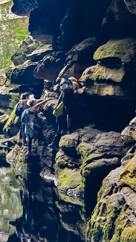 Quando se chega ao final, existem algumas opções para ver a cachoeira de lugares diferentes. Cruzamos o rio e fomos no lugar que é o mais famoso.